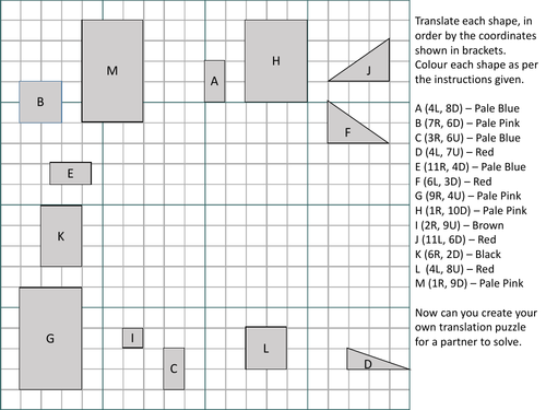 Translation Worksheets - Tutoringhour.com Graph the translated image of each figure using the number of units to be moved and the direction (up, down, left or right) as specified. Verify your responses using the answer key attached to the worksheet. This set of printable worksheets is customized for grade 7 and grade 8 students. CCSS: 8.G